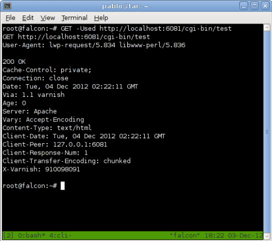 下面的GET命令是perl的libwww-perl中的。使用这个命令可以看到varnish返回的HTTP响应的细节。如果你的系统里没有安装libwww-perl,也可以使用Firefox中live HTTP Headers扩展,或者使用其他类似工具也可以。