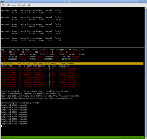 首先对比响应时间,虽然截图上没有直接显示时间,但是我们可以从ab结束的时间计算出来,apache是23ms每次请求(2097rps),varnish是4ms每次请求(12099rps)。最大的差异是平均负载,Apache使系统的负载达到了12,使用varnish时则一直保持在0~0.4。在从apache切换到varnish做测试时,甚至要等上几分钟,系统负载才能回复正常,最好在非生产环境下用比较空闲的机器做这些测试。