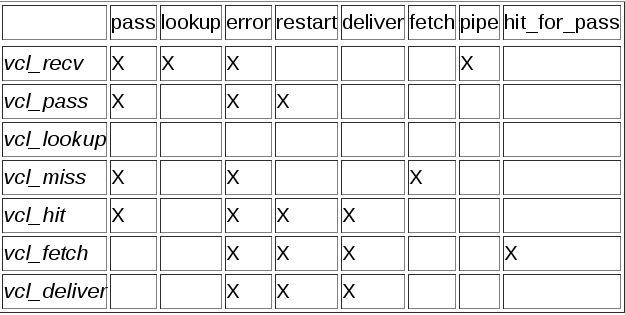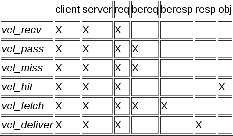 如前所述,通过default.vcl来控制varnish的缓存策略,通过子程序的返回值来控制varnish的动作。子程序的返回值可以基于req和resp对象,也可以基于客户端对象,服务端对象或者后端服务器对象。但在子程序处理过程中,上述数据对象并非一直都可用。另外要注意子程序的返回值会有一定的限制范围,一个难点就是记住在什么时候,哪个子程序中什么数据对象是可用的,合法的返回值有哪些。为了让这个问题更清晰一些,下面是一张表格,可以在修改配置的时候快速参考: