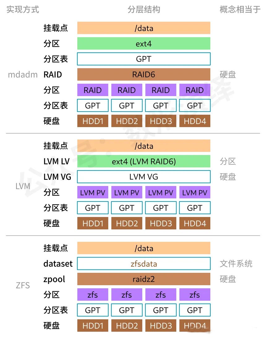 与 Btrfs 并列的 ZFS 支持类似的功能,其稳定性得到了广泛的验证,且支持文件系统级别的多磁盘管理,实现类似 RAID 的数据冗余机制。其问题在于许可证限制不能包含在 Linux 内核内,升级维护成本较高。
