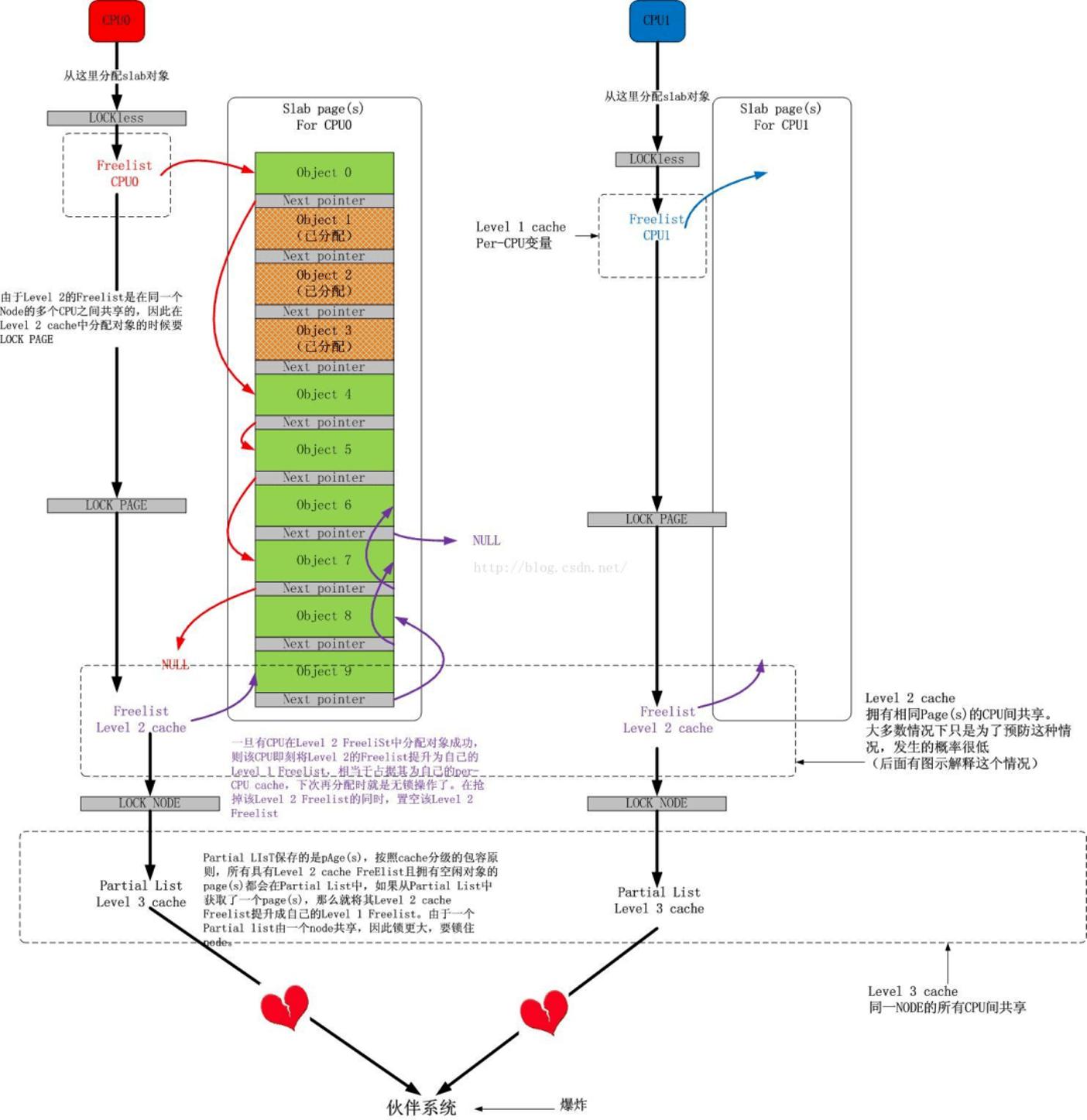 这是可能的,因为对单独一种slab的需求是和该CPU上执行的进程/线程紧密相关的,比如如果CPU0只处理网络,那么它就会对skb等数据结构有大量的需求,对于上图最后引出的问题,如果我们选择从伙伴系统中分配一个新的page(或者pages,取决于对象大小以及slab cache的order),那么久而久之就会造成slab在CPU间分布的不均衡,更可能会因此吃掉大量的物理内存,这都是不希望看到的。