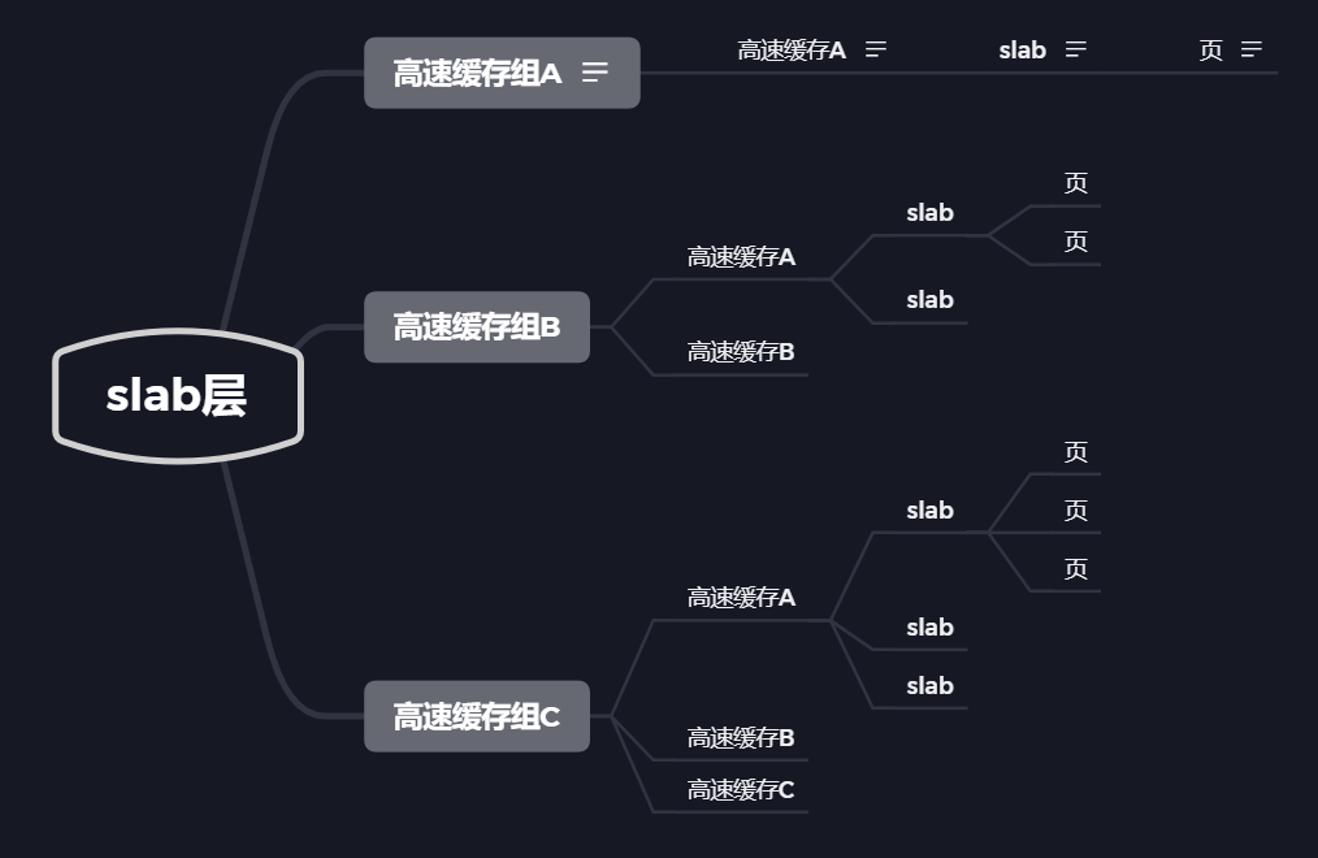 slab和伙伴系统是上下级的调用关系,伙伴关系按照页管理内存,slab 按照字节管理,slab 先从伙伴系统获取数个页的内存,然后切成分成固定的小块(称为object),然后再按照声明的对象数据结构分配对象。