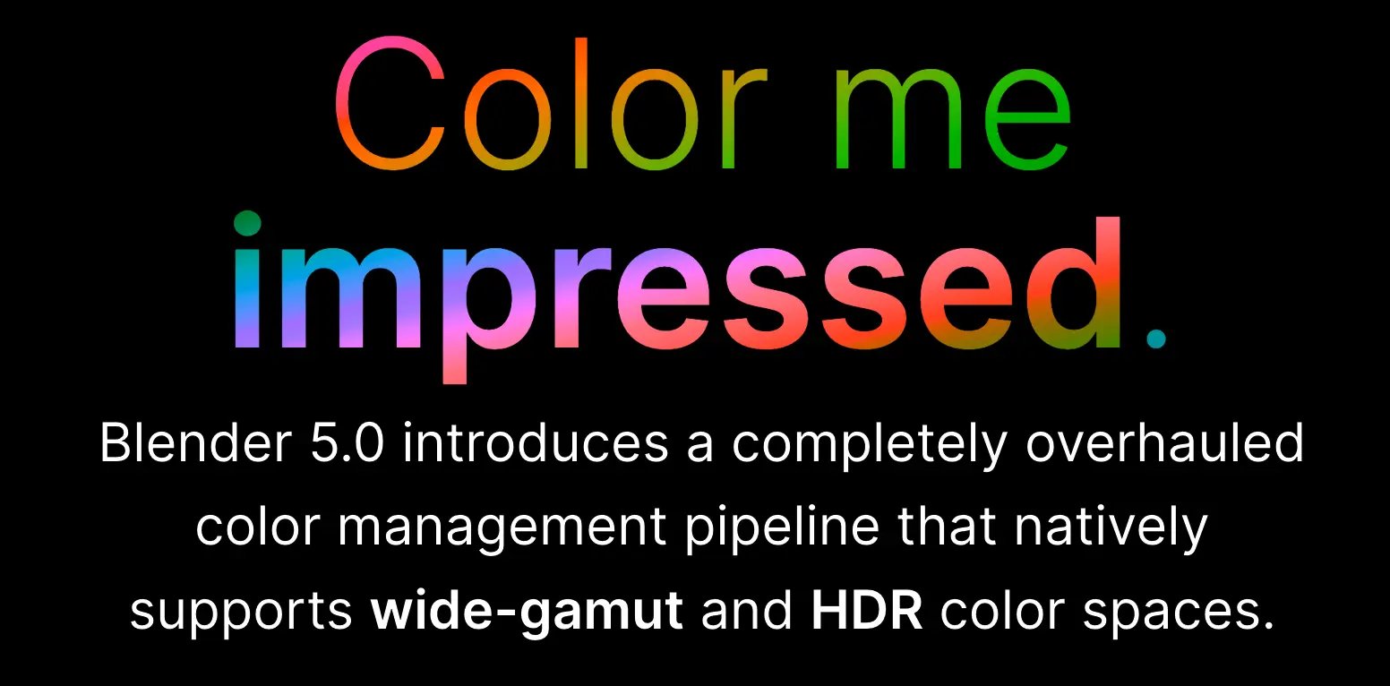 v5.0 已于 2025 年 11 月 18 日正式发布。作为大版本更新(4.x → 5.0),这意味着 Blender v5.0 不只是小修小补,而是包含多个重大升级&潜在破坏性变更。官方强调:色彩管理与 HDR/广色域支持 是一个核心突破。v5.0 引入了一套完全重新设计的色彩管理流程,原生支持广色域和 HDR 色彩空间。