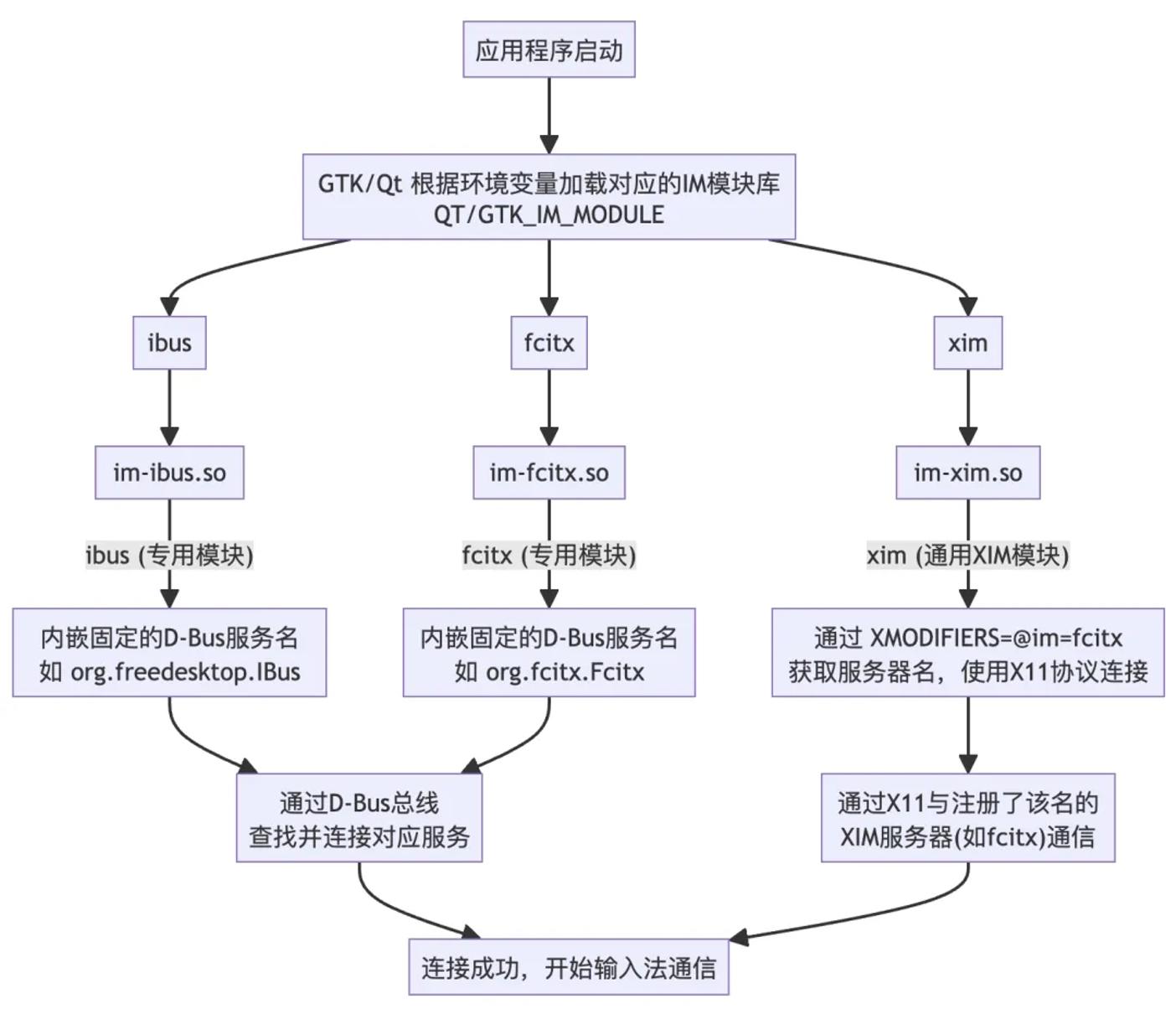 | GTK/QT_IM_MODULE=fcitx | im-fcitx.so、 libfcitxplatforminputcontextplugin.so | 库内嵌逻辑 -> D-Bus服务名 (org.fcitx.Fcitx) |