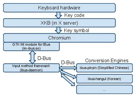 逻辑:应用 -> GTK/QT的 ibus 模块 -> D-Bus -> IBus 输入法服务。