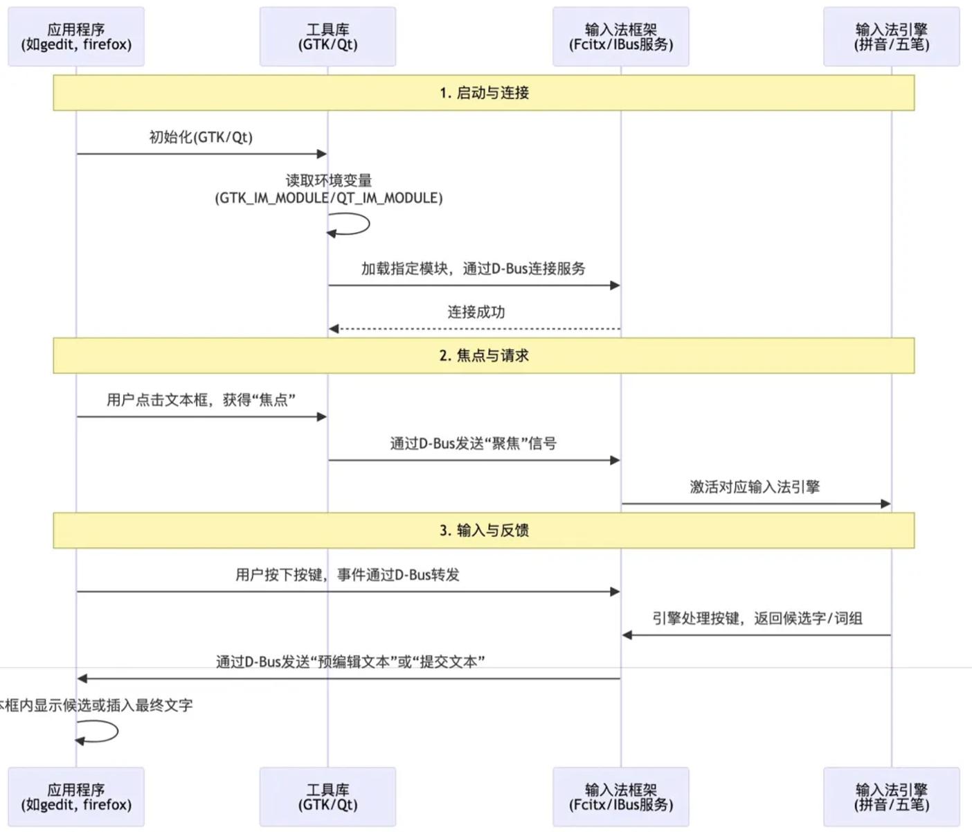 逻辑:应用 -> GTK/QT的 fcitx 模块 -> D-Bus -> Fcitx 输入法服务。