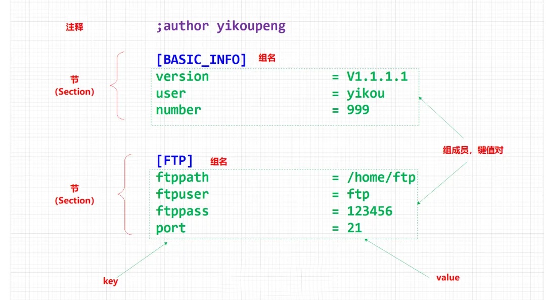 INI文件中的各个部分通过方括号 [] 包裹的名称来定义,例如 **[Section1]**。每个节可以包含多个键值对。