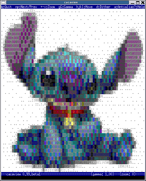 libcaca is a software library that converts images into colored ASCII art. It includes the library itself, and several programs including cacaview, an image viewer that works inside a terminal emulator, and img2txt, which can convert an image to other text-based formats.Is a graphics library that outputs text instead of pixels, so that it can work on older video cards or text terminals.