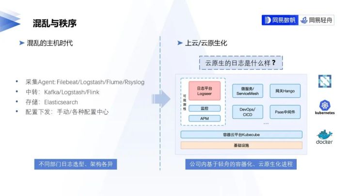 早期公司内部业务跑在物理机上时,各业务使用的日志采集工具、日志中转和存储、配置下发都比较混乱,选型种类多。公司内基于轻舟平台推进了各服务容器化和云原生化,随着服务不断地迁移到K8s上,我们关于采集K8s容器日志和日志平台方面积累很多实践经验。