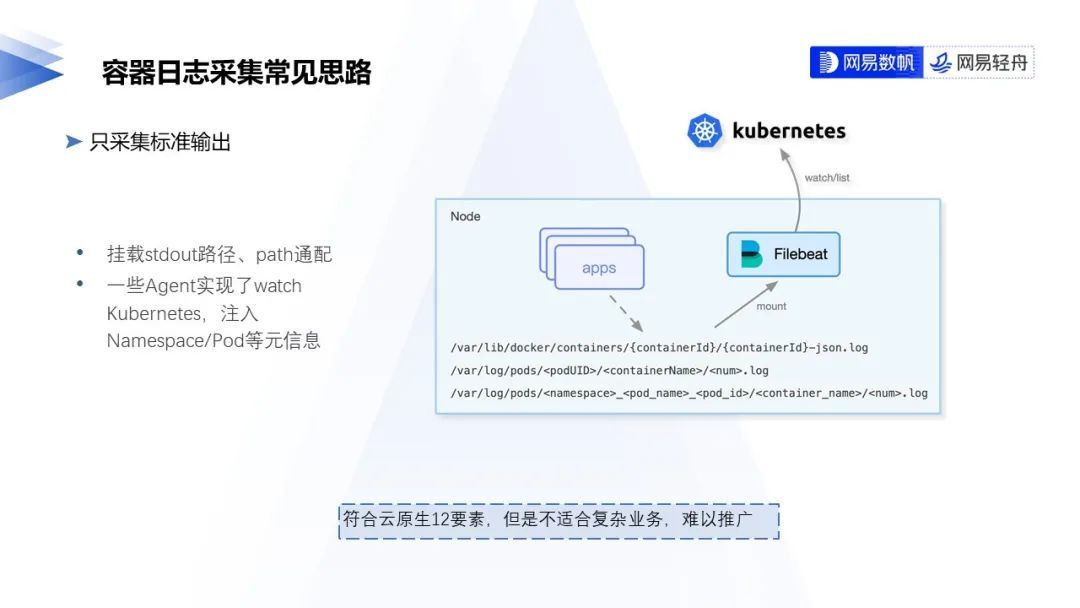 日志打印到标准输出的操作虽然符合云原生十二要素,但是很多业务还是习惯输出到日志文件中,而且只采集标准输出日志难以满足一些复杂业务的需求。常规的采集标准输出日志的方式是挂载/var/lib/docker,/var/log/pods下的目录。同时需要注意选型的日志Agent是否支持注入k8s元信息。
