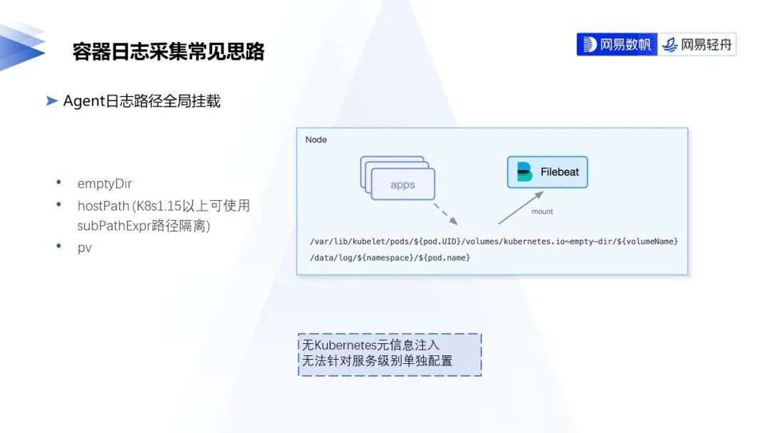 日志可以放在EmptyDir,HostPath或PV存储中,通过DaemonSet方式把日志采集Agent部署到每一台k8s节点上。EmptyDir等存储映射到节点的目录可以通过通配的方式配置到Agent进行采集,由Agent读取配置路径下的日志文件。