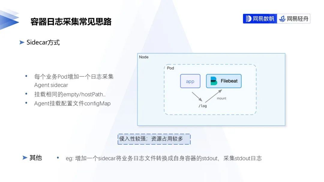 每个业务Pod在部署时都增加一个日志采集的Agent SideCar,可以通过容器平台或k8s webhook的方式把日志采集Agent注入到Pod内。Agent可以通过挂载相同的HostPath或EmptyDir的方式采集到业务容器的日志。