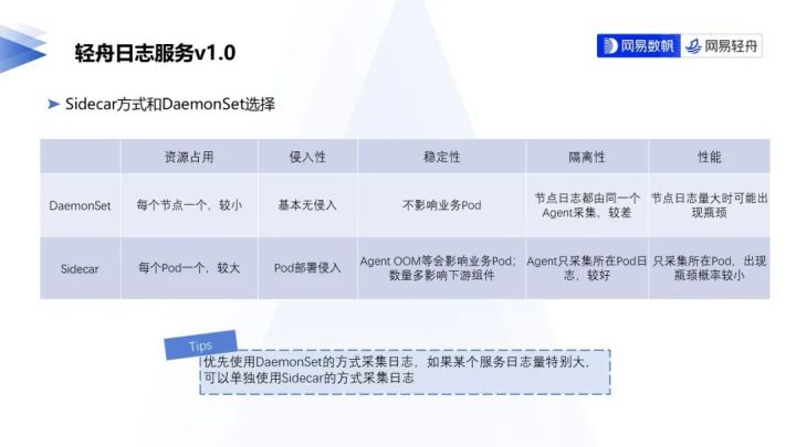 对比DaemonSet和SideCar两种部署方式,DaemonSet在稳定性、侵入性、资源占用方面有优势,但隔离性、性能方面SideCar方式更好。我们实践中会优先使用DaemonSet方式采集日志。如果某个服务日志量较大、吞吐量较高,可以考虑为该服务的Pod配置Sidecar方式采集日志。