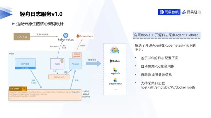 部署方面,FileBeat、Ripple通过SideCar方式部署在一起,Ripple监听k8s。在使用方面,用户通过CRD,一个CRD可以表示一个服务的日志采集配置,Ripple可以和k8s交互感知到Pod生命周期。Ripple可以下发配置到Agent,自动添加Pod相关元信息并注入到日志中。存储方面HostPath、EmptyDir、PV、Docker Rootfs都可以支持。