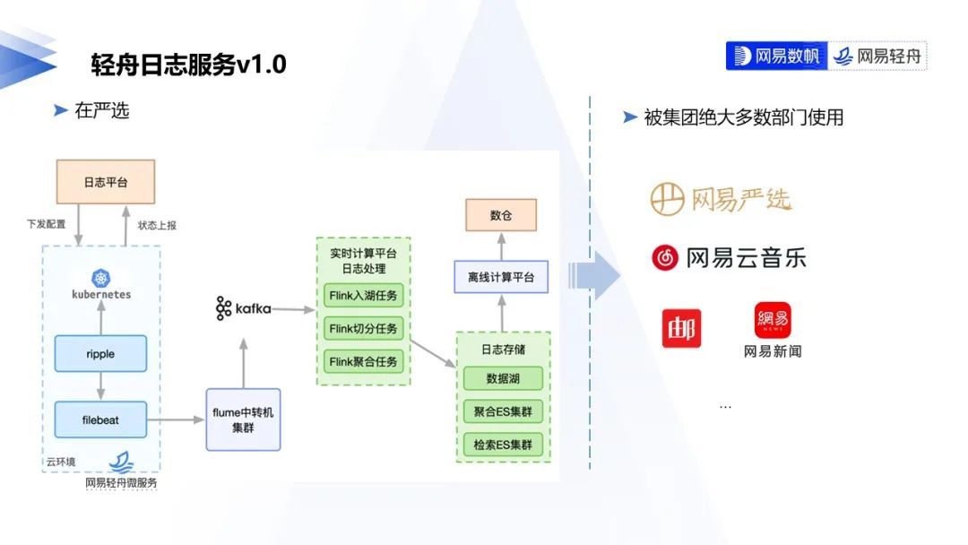 图中日志采集的架构先在网易严选进行了应用,后面逐渐地被公司内绝大多数部门参考落地,具体架构会根据实际环境有所区别。首先日志平台下发配置,Ripple监听到K8s的CRD配置变动后,把配置下发给Filebeat。Filebeat把采集到的日志发送到中转机,中转机发送给Kafka,Flink消费Kafka数据进行处理后转发给后端日志存储。