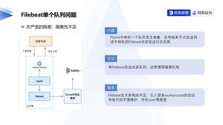 在前面介绍的架构中,Filebeat会把每个服务的日志发送给中转机。但是Filebeat是一个单一的队列架构,在中转机的阻塞会影响整个节点的Filebeat日志上报。我们尝试把Filebeat改造成多队列的模式增强隔离性,但是由于Filebeat本身的设计架构局限,重构的效果和运行状态都不理想,同时与开源版本的维护和升级存在很大困难。