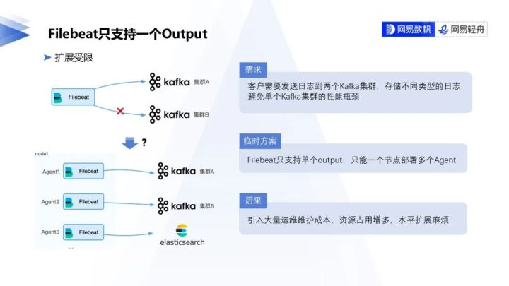 Filebeat只支持单个Output,当用户需要把日志发送到多个Kafka集群时,只能在同一个节点上部署多个Filebeat。导致运维成本高、计算资源消耗大、水平扩展困难。