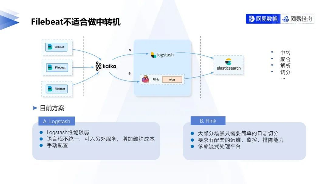 Filebeat设计之初是为了解决Logstash的问题,作为轻量级的日志采集端运行,不适合作为中转。Logstash在日志切分、解析等方面表现出色,但是问题在于性能较弱。虽然Flink性能和表现出色,但我们的很多场景只需要简单的日志切分,Flink一般依赖流式处理基础平台的支持,同时在交付过程中用户要额外付出Flink的机器和运维成本,所以我们需要一个更轻量、成本更低的方案。