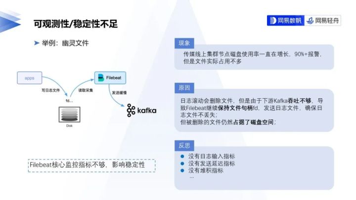 我们以一个线上问题为例。线上某集群经常遇到磁盘使用量短时间内暴增到90%以上并触发报警的情况。实际登录节点排查问题后,发现报警的原因在于下游Kafka吞吐量不够,一些日志文件没有完全采集完毕,Filebeat进程默认保留文件句柄直到文件采集完毕,由于文件句柄没有释放,底层的文件无法被真正删除。但在这种情况下,Filebeat缺乏输入延迟、发送延迟和堆积情况等指标,影响稳定性。