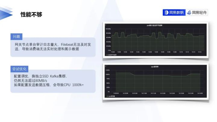 在一个大流量的节点,我们发现Filebeat发送数据到下游Kafka时整体数据处理速度不理想,于是进行了很多优化的尝试,比如换SSD的Kafka集群、改Kafka配置、优化Filebeat配置等调优。我们发现在Filebeat不打开数据压缩的情况下,最大数据发送速度达到80MB/s后很难再有提升,打开数据压缩后Filebeat的CPU的消耗又暴增。调整Kafka或Filebeat参数、机器等配置的优化效果不明显。