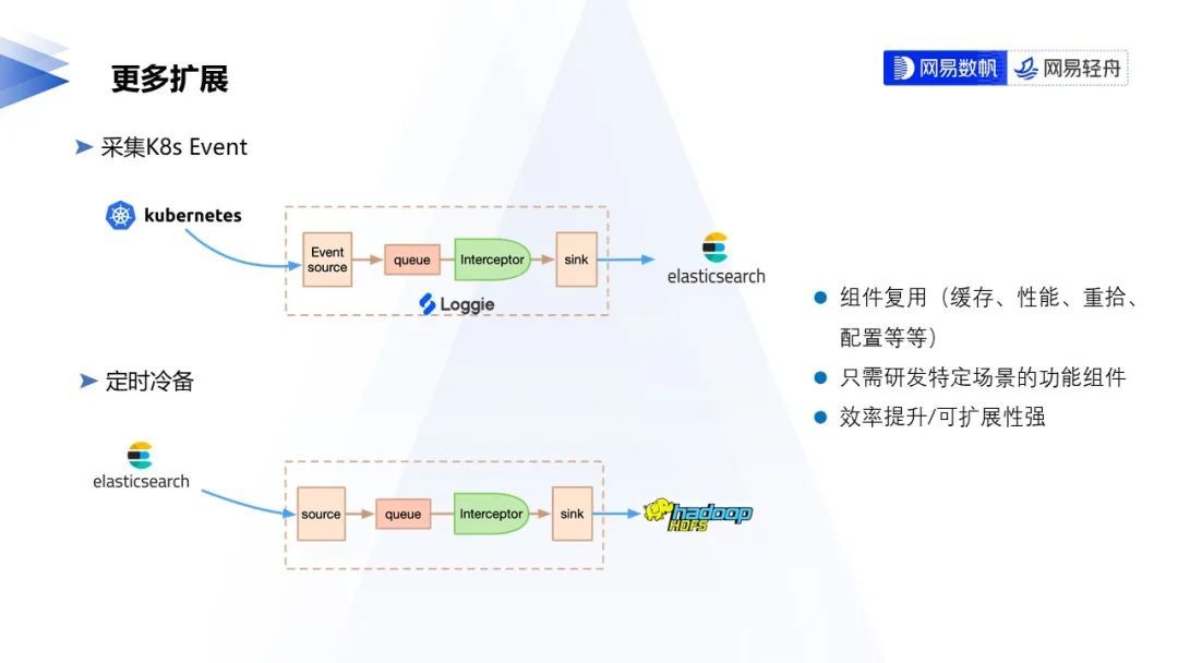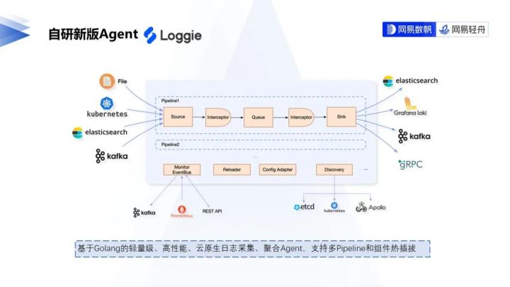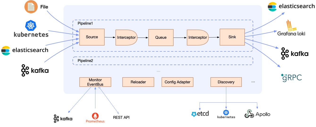 可扩展、热插拔:配置不同的Source/Interceptor/Sink,拥有中转、过滤、解析、切分、日志报警等能力,可使用Golang快速自研插件