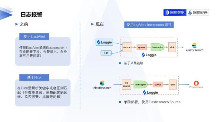 在采用Loggie后,我们可以使用logAlert Interceptor,在日志采集过程中就可以通过关键字匹配识别info或error进行报警。也可以通过单独部署Elasticsearch Source的Loggie Aggregator对Elasticsearch进行轮询,把信息发送到Prometheus进行报警。新版日志报警架构更轻量,维护起来也更简单。