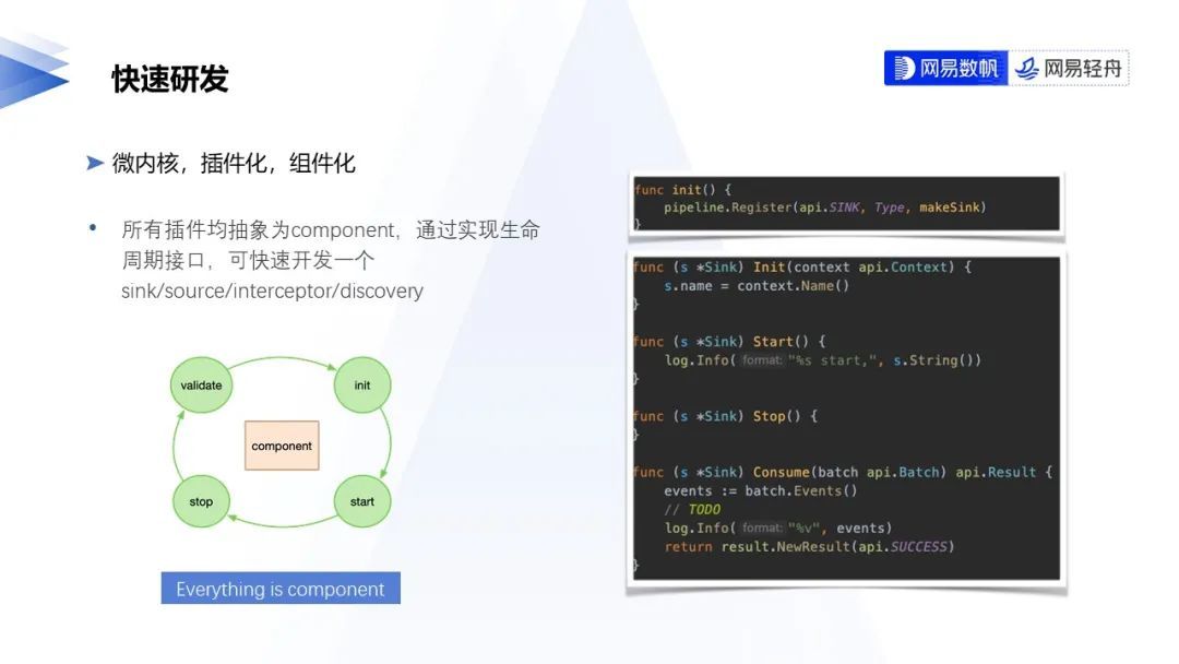 在项目开发方面,我们秉承微内核、插件化、组件化的原则,把所有组件抽象为component。开发者通过实现生命周期接口,可以快速开发数据发送端逻辑、数据源读取逻辑、处理逻辑和服务注册逻辑。这样的设计让需求能更快更灵活地实现,大大了日志采集侧的开发效率。