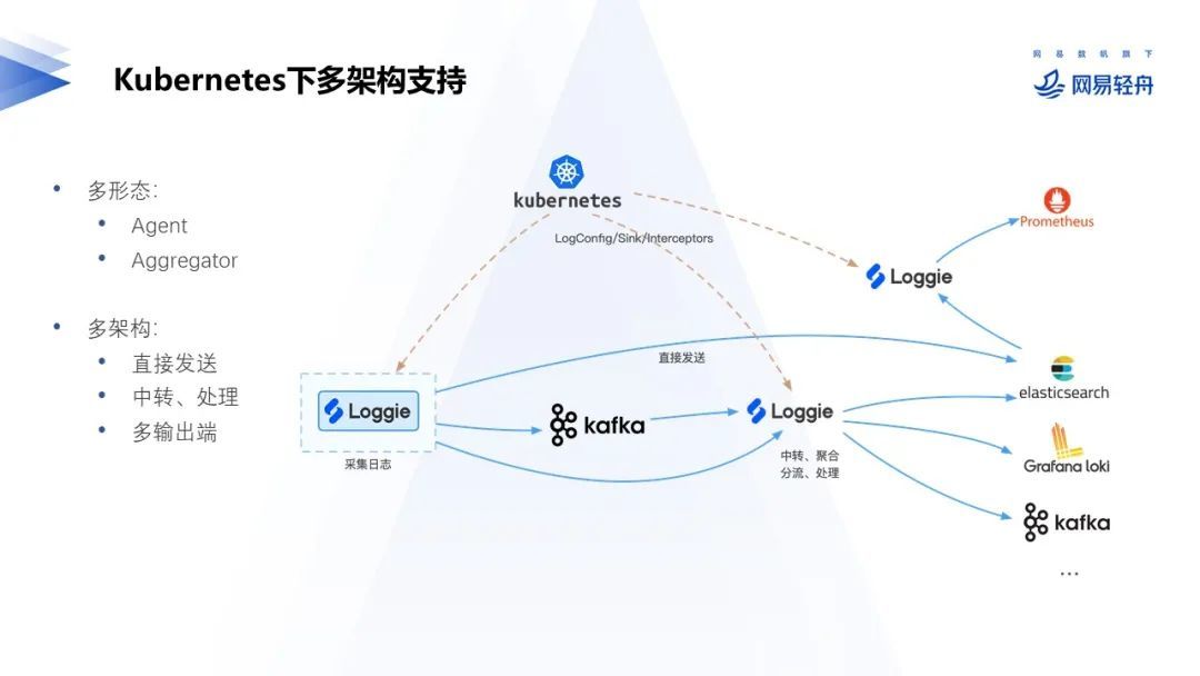 在k8s中我们提供了多种部署方案,作为Agent部署时,我们提供了DaemonSet或SideCar方式进行部署。作为中转节点部署时可以作为StatefulSet部署。日志采集的架构上更加灵活,可以直接发送到ES,也可以发送给Kafka再交给中转节点,部署方便。