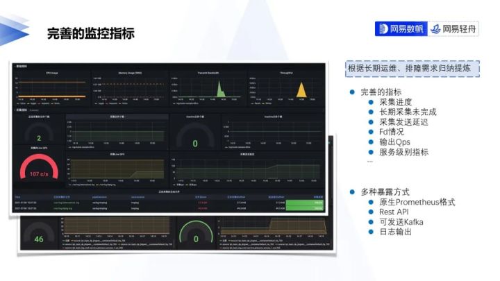 我们为日志采集Agent添加了完善的指标,包括日志采集进度、长期采集未完成、采集发送延迟、FD数量、输出QPS和其他服务级别指标,提供了原生Prometheus格式的接口、RestAPI和指标发送Kafka等方式暴露指标。