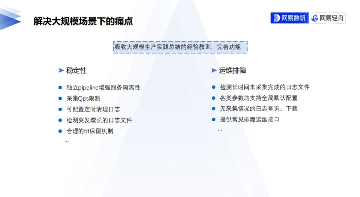 日志采集服务大规模部署的稳定性和排障两方面有很大提升。我们通过独立各个采集任务Pipeline增强服务隔离性,还可以通过Interceptor提供了QPS限制,定时清理日志防止磁盘写满,增加了日志文件突发增长检测和合理的Fd保留机制等。
