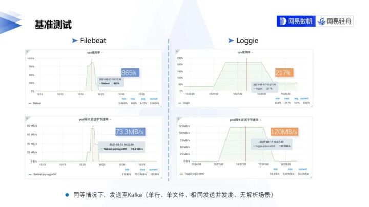 我们利用Filebeat进行了基准测试,在处理单行、单文件、相同发送并发度、无解析的场景下,发送日志至Kafka。