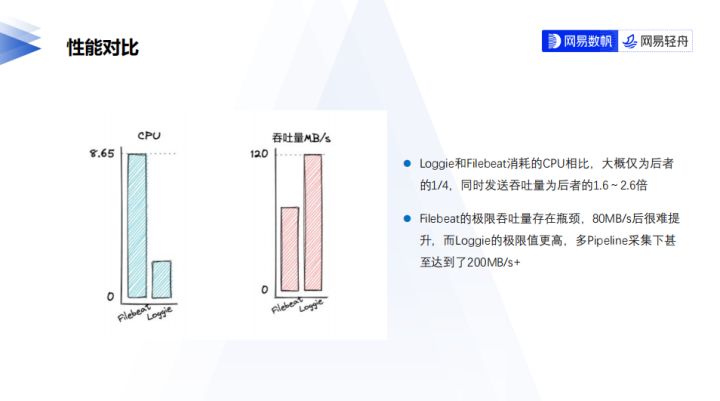 测试结果上看Loggie性能大幅度提升,消耗CPU为Filebeat的1/4、吞吐量为Filebeat的1.6-2.6倍,且极限吞吐量与Filebeat的80MB/s瓶颈提升到200MB/s以上。