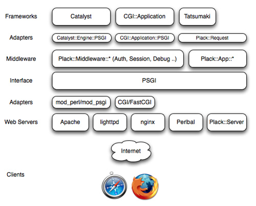 Plack is a set of tools for Perl programming of Web applications and running frameworks compatible with the PSGI specification, such as Catalyst and Dancer.