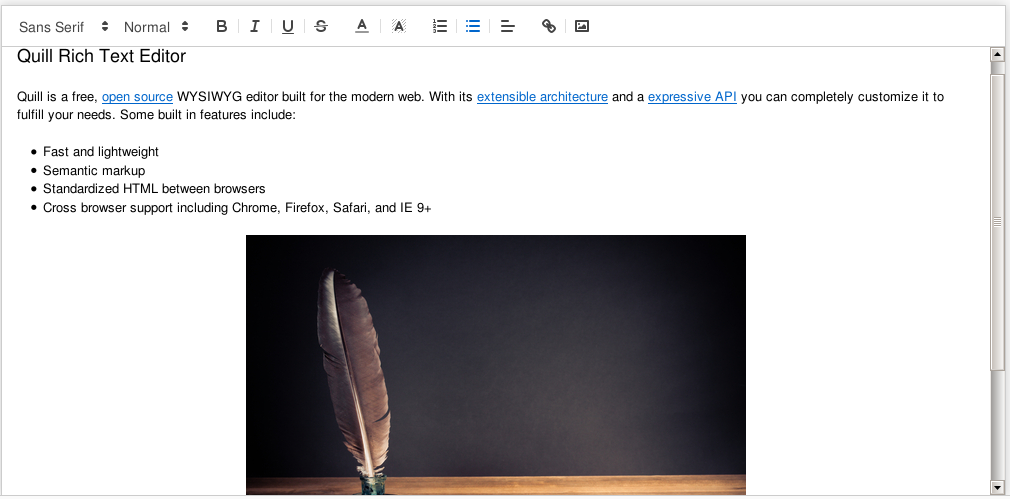 Quill 是一个开源的富文本编辑器,基于可扩展的架构设计,提供丰富的 API 进行定制。采用3类BSD协议授权。Quill is a free, open source WYSIWYG editor built for the modern web. With its extensible architecture and a expressive API you can completely customize it to fulfill your needs.