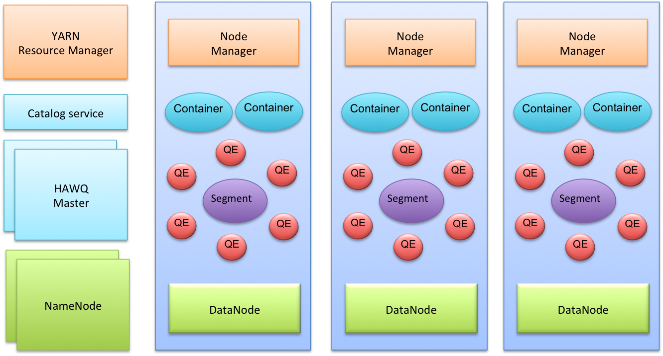 下图是一个典型的HAWQ集群的主要组件。其中有几个Master节点:包括HAWQ master节点,HDFS master节点NameNode,YARN master节点ResourceManager。现在HAWQ元数据服务在HAWQ master节点里面,将来的版本会成为单独的服务,其他节点为Slave节点。每个Slave节点上部署有HDFS DataNode,YARN NodeManager以及一个HAWQ Segment。HAWQ Segment在执行查询的时候会启动多个QE (Query Executor, 查询执行器),查询执行器运行在资源容器里面。