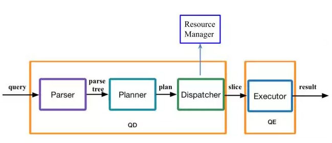 用户通过JDBC/ODBC提交查询之后,查询解析器得到查询树,然后优化器根据查询树生成查询计划,派遣器和资源管理器打交道得到资源,分解查询计划,然后派遣计划到Segment的执行器上面执行。最终结果会传回给用户。