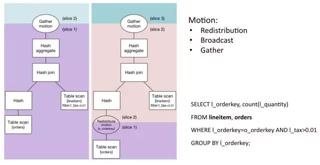 左边的查询计划表示了如果表lineitem和orders都使用了连接键进行分布的情况。在这个例子中,lineitem按照l_orderkey进行hash分布,orders表按照o_orderkey进行分布,这样的话两个表做连接的时候是不需要进行重新分布的,右边的查询计划表示了一个需要重新分布数据的例子。该查询计划和左边的查询计划相比多了一个Motion节点。