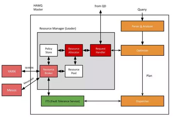 现在HAWQ支持多极资源队列。可以通过DDL方便的定义和修改资源队列定义。下面是HAWQ资源管理器的主要架构图: