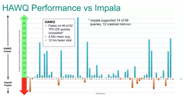 A: HAWQ和Hive及Impala性能相比,标准化TPCDS性能测试要快数倍。而且Hive和Impala支持SQL标准有限,很多TPCDS查询执行不了。