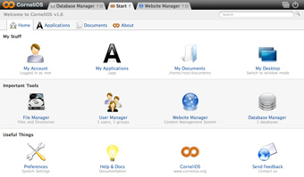CorneliOS applications are basically small websites using the CorneliOS CORA framework and CorneliOS technologies such as CornelioSCRIPT and extended HTML tags. The basic installation includes a set of useful apps including a user manager, a file manager, a Content Management System (CMS) and a database manager.