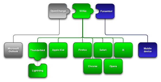 SOGo offers multiple ways to access the calendaring and messaging data. Your users can either use a web browser, Microsoft Outlook, Mozilla Thunderbird, Apple iCal, or a mobile device to access the same information.