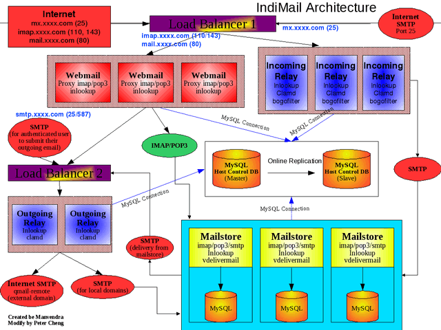 IndiMail provides routers for SMTP, IMAP and POP3. This enables a domain to be extended across multiple servers and hence gives IndiMail the ability to distribute the users across multiple hosts using standard non-proprietary protocols and RFCs. You can have your users distributed on multiple servers, each server located anywhere on the net. Using a utility called 'hostcntrl', you can also add foreign users. This allows IndiMail to have a heterogeneous email server environment without the need for multiple domains (with some users on MS Exchange and some on Lotus Notes some on IndiMail). You can have multiple hosts hosting a domain placed geographically anywhere and tied up by IndiMail. Your Brazil users can have a server in Brazil and India users on server located in India and yet have the Indian user access all his/her mails when in Brazil. The IndiMail architecture also allows you to migrate seamlessly from a proprietary messaging products. The IndiMail architecture does not force a networked filesystem or NAS storage to be used for serving large number of users (typically in an ISP/MSP environment)