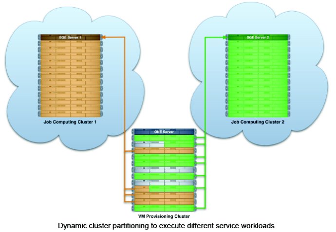 将一群实体 cluster 转换弹性的虚拟基础设备,且可动态调适 service workload 的改变,ONE 在 service 和实体机处设备间产生新的虚拟层 (virtualization layer),这个 layer 可支持丛集的 service 执行和加强 VMMs (Virtual Machine Monitor) 的效益。