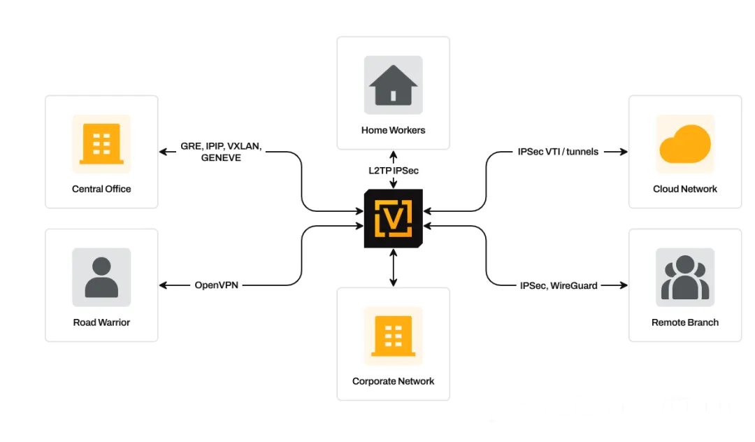 VyOS 支持多种 VPN 协议,包括 IPsec、OpenVPN 和 WireGuard,可以构建安全的 VPN 连接,实现远程访问和站点到站点连接。