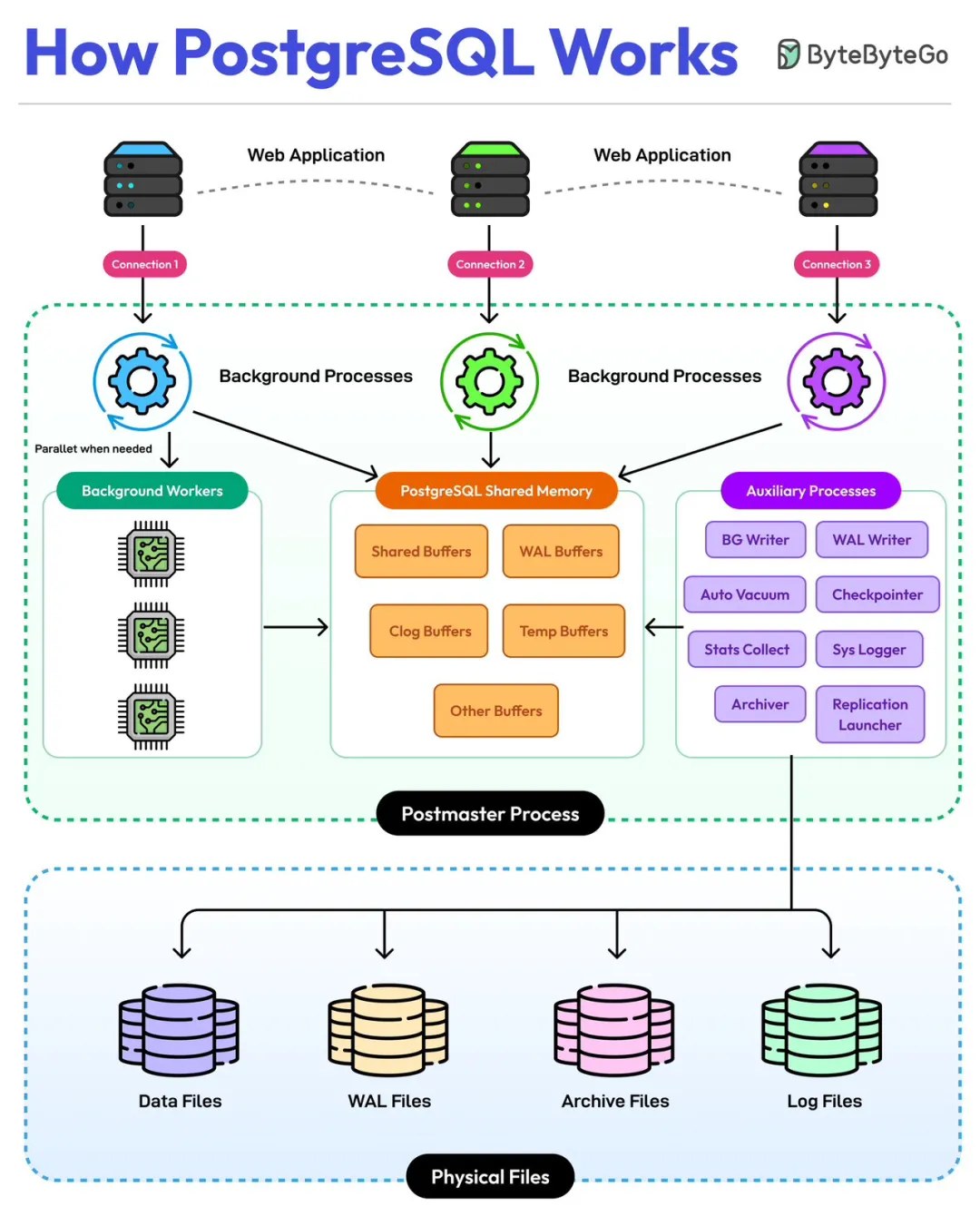 多个应用(图中 Web Application)通过 Connection 1/2/3 与 PostgreSQL 建立连接,发送查询、写入等请求。每个连接对应数据库的一个“会话”,处理应用的交互。