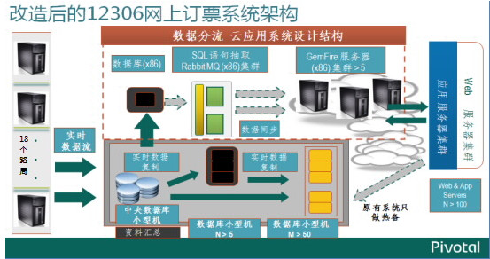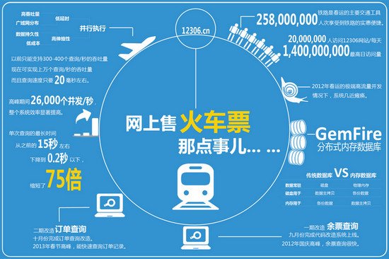 2012年3月开始,铁路总公司(原铁道部)开始调研、改造12306。2012年6月选择了Pivotal GemFire分布式内存计算平台(Distributed In-memory computing)改造12306,一期先改造12306的主要瓶颈——余票查询系统。9月份完成代码改造,系统上线。2012年国庆,又是网上订票高峰期间,大家可以显著发现,可以登录12306,虽然还是很难订票,但是查询余票很快。2012年10月份,二期用 GemFire改造订单查询系统(客户查询自己的订单记录)。2013年春节,又是网上订票高峰期间,大家可以显著发现,可以登录12306,虽然还是很难订票,但是查询余票很快,而且查询自己的订票和下订单也很快。