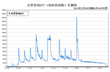 根据系统运行数据记录,技术改造之后,在只采用10几台X86服务器实现了以前数十台小型机的余票计算和查询能力,单次查询的最长时间从之前的15秒左右下降到0.2秒以下,缩短了75倍以上。2012年春运的极端高流量并发情况下,系统几近瘫痪。而在改造之后,支持每秒上万次的并发查询,高峰期间达到2.6万个查询/秒吞吐量,整个系统效率显著提高。如上图所示。