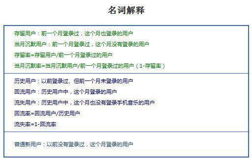 还会涉及到的其他术语有:历史用户、回流用户、存留用户等。