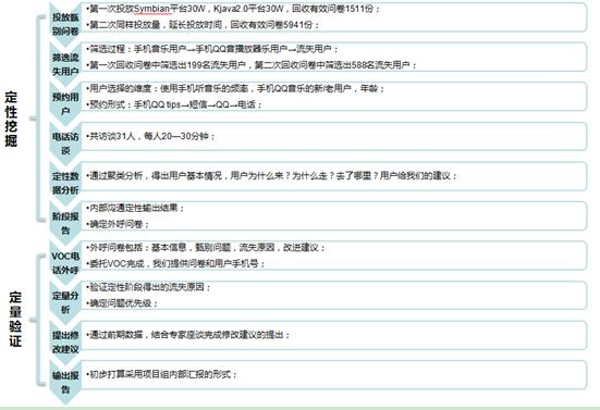 定性挖掘→数据分析→定量验证→数据分析→输出报告→评审→跟进产品改进。以手机QQ音乐播放器流失用户研究为例,我制定的操作流程如下: