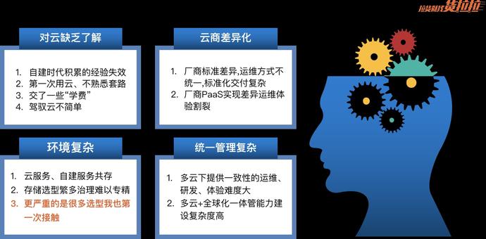 3.云商间的产品化差异也给统一治理&管控带来很大的挑战,比如实现分库分表可以使用阿里云的DRDS如果换到aws呢?又或者其他云呢?各家云产品解决方案是有差异的,这就给产品跨云移植带来很大挑战。